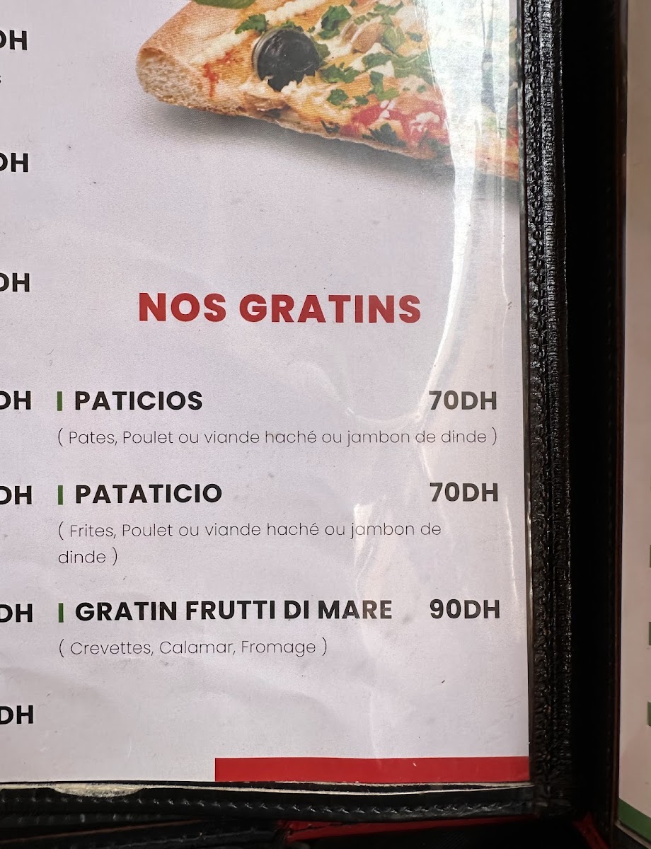 The Nos Pizzas et Gratins (Our Pizzas and Gratin Dishes) feature a variety of choices, each one topped with high-quality ingredients. The Pizza Margherita is a classic choice, while the Pizza 4 Fromages offers a rich, cheesy experience. If you're in the mood for something more substantial, the Gratin de Pommes de Terre (Potato Gratin) is an excellent choice to enjoy alongside your pizza.