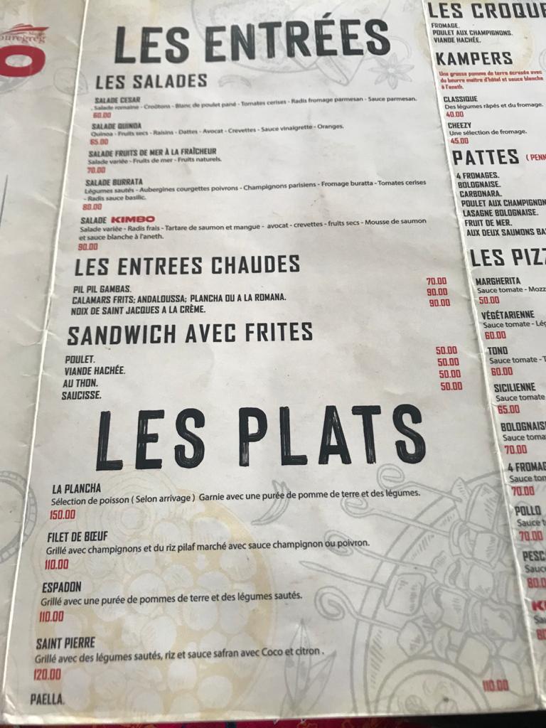 Moving on to the Entrées Froides et Chaudes (Cold and Hot Starters), Kimbo Marina provides an enticing selection of both cold and warm appetizers. For example, the Salade Niçoise is a fresh and flavorful choice, while the Bruschetta Tomate Basilic is a tasty warm option to enjoy with a glass of wine or an aperitif.